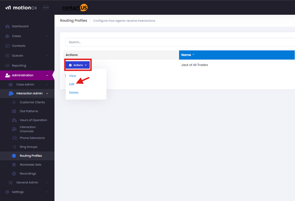 Select the Routing Profile, Right click on the "Actions" Button and from the drop down select "Edit".