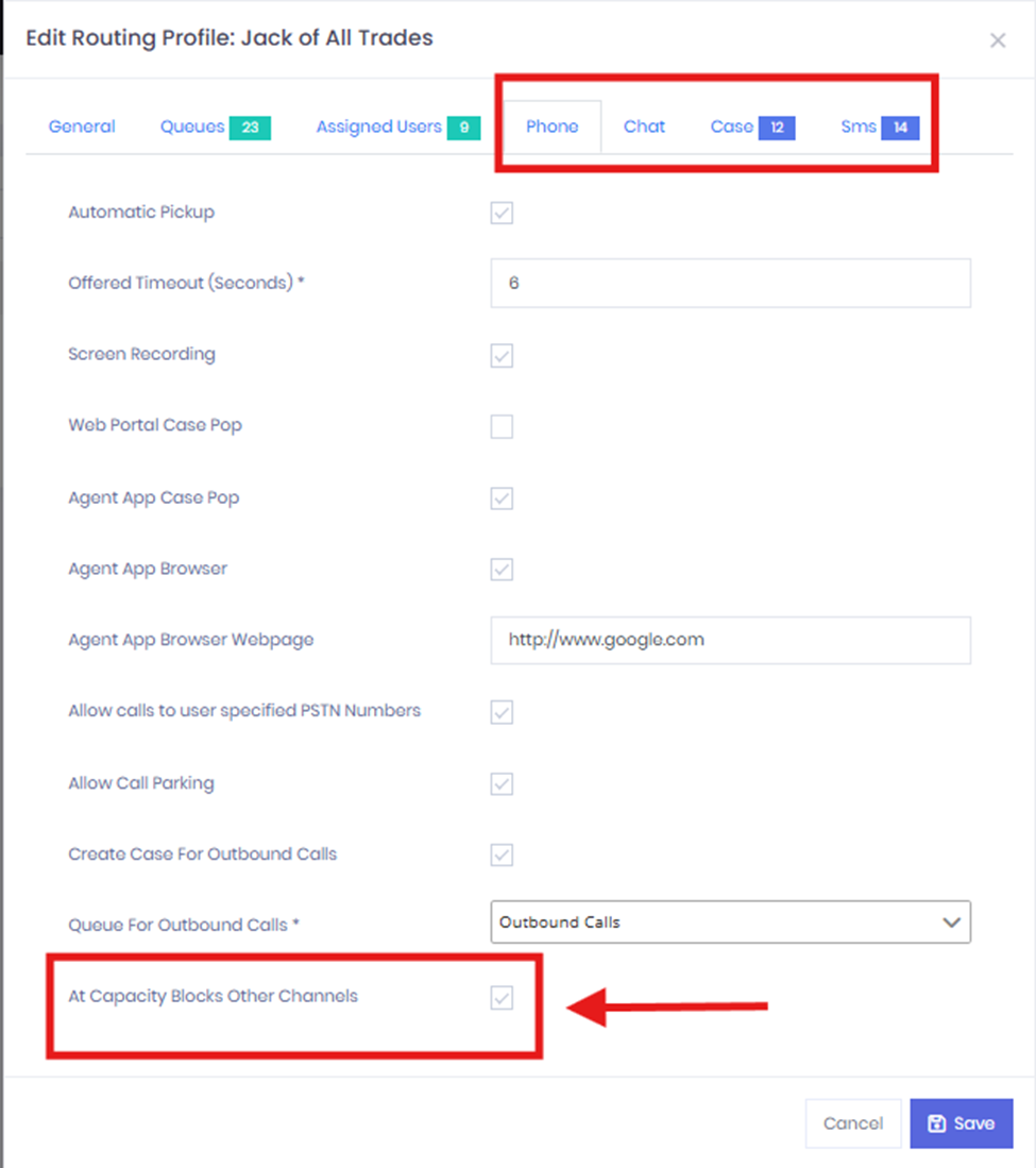 A sub-window will appear to edit the Routing Profile. Under the Phone, Chat, Case, and SMS tabs at the very bottom you will find the " At Capacity Blocks Other Channels ". To ensure its been enabled, make sure there is a check mark in the box next to it and select the "Save" Button. The default value is Enabled (checked).