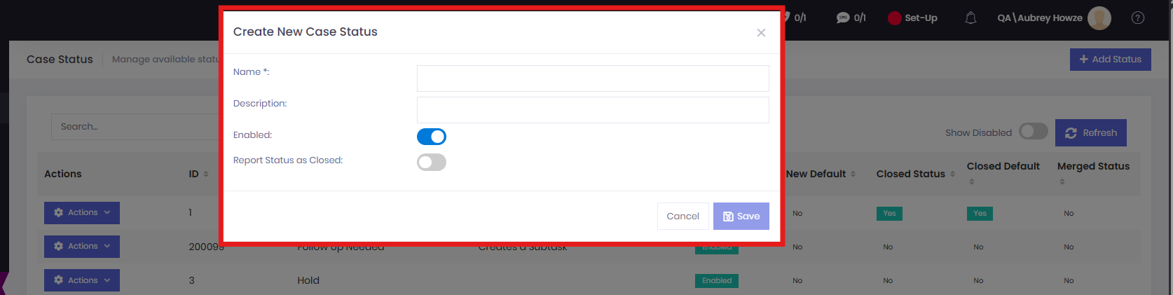 When creating a new status, a modal window appears over the Case Statuses page, prompting the user to enter a name and description, and to specify whether the status is enabled and whether it should be reported as closed.