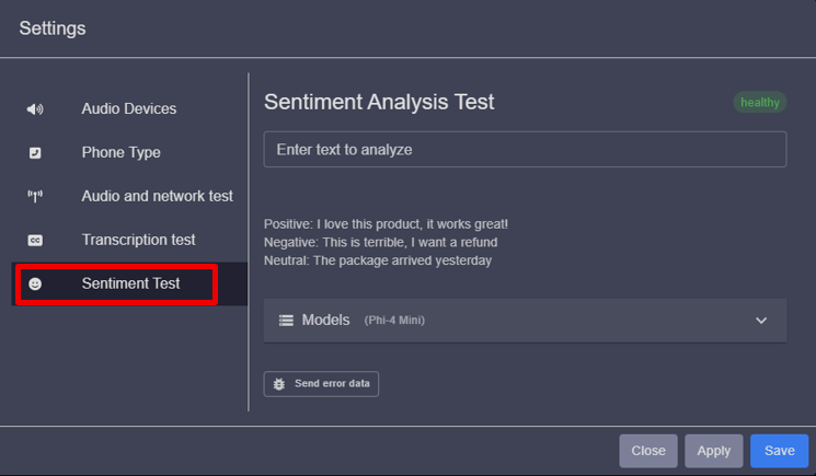 Within the Sentiment Test sub-menu, users can review the Sentiment models in use, and verify the health of the sentiment analysis, along with testing the sentiment by providing example phrases to determine the mood .