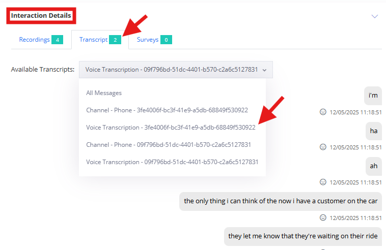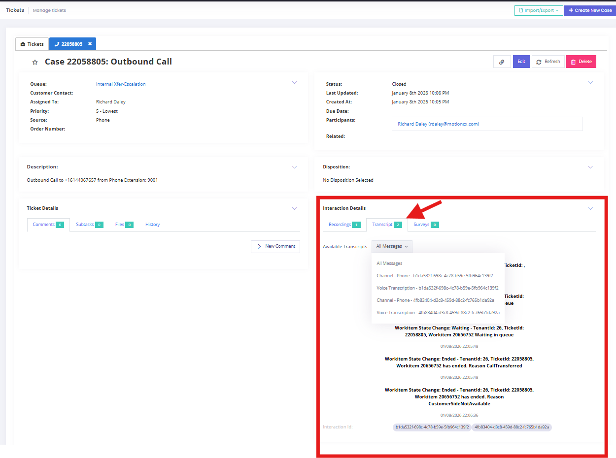 Users with the required permissions can access voice transcriptions from within the case. Under Interaction Details in the bottom-right corner, select Transcript (when available) to review the call. If sentiment analysis is enabled, it will be displayed in the transcript using a face icon.